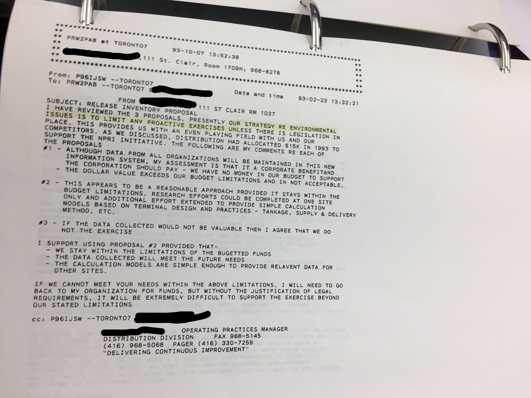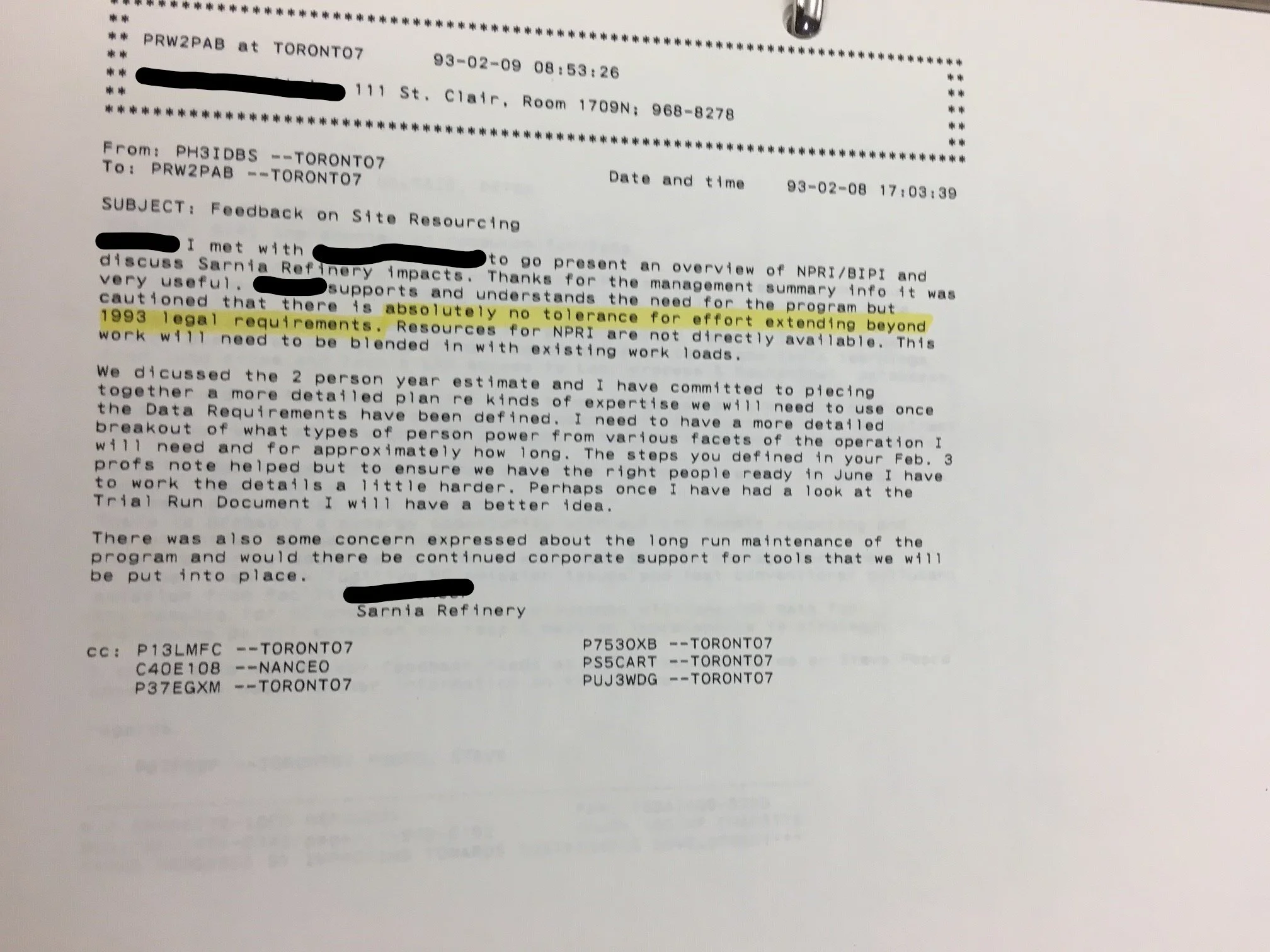 Email from Toronto Operating Practices Manager to Imperial Oil Refinery Sarnia NPRI Development Team, Feb 08, 1993. Glenbow Archives, Imperial Oil Papers, IOL pub -3e-37b. Anonymized.