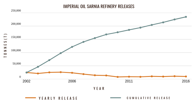 Below are three charts that use NPRI data give a sense of how pollution adds up over time across the Imperial Oil Sarnia complex.